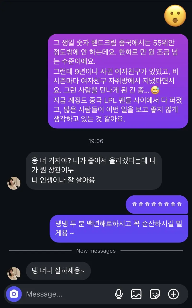 她:"你是乞丐吗?我是因为喜欢才上传的,和你有什么关系?(非敬语)过好你自己的生活啵(典型韩式阴阳句式)"